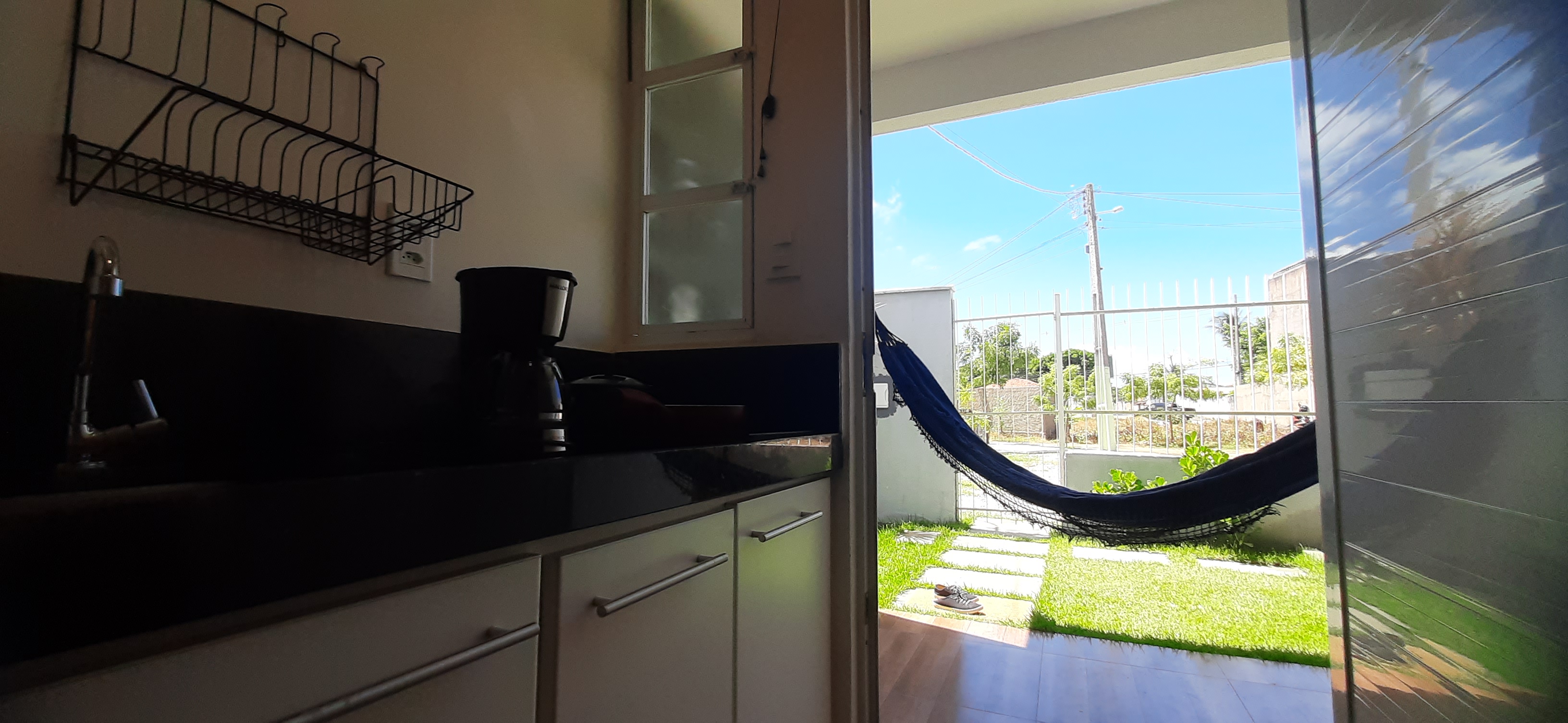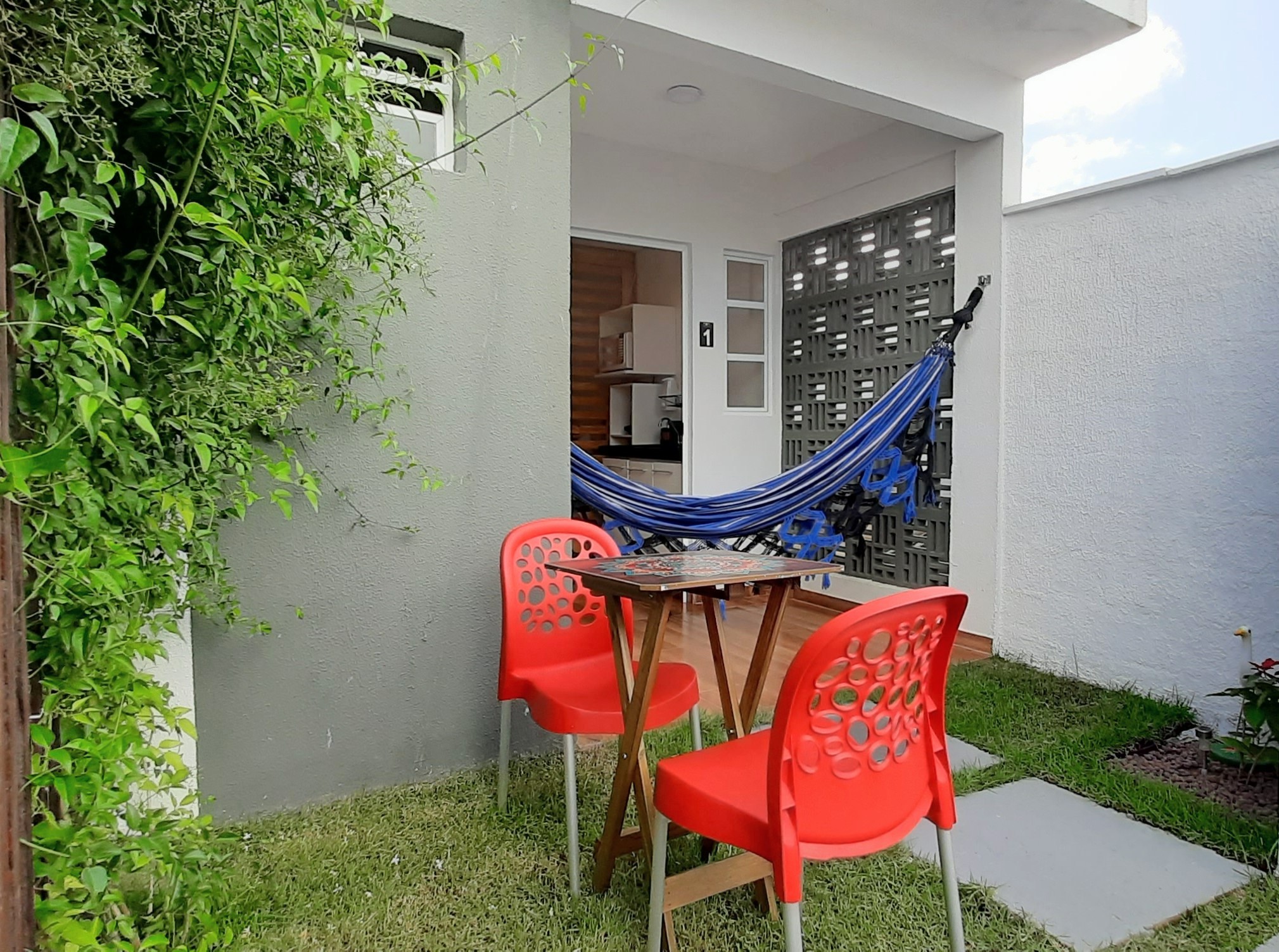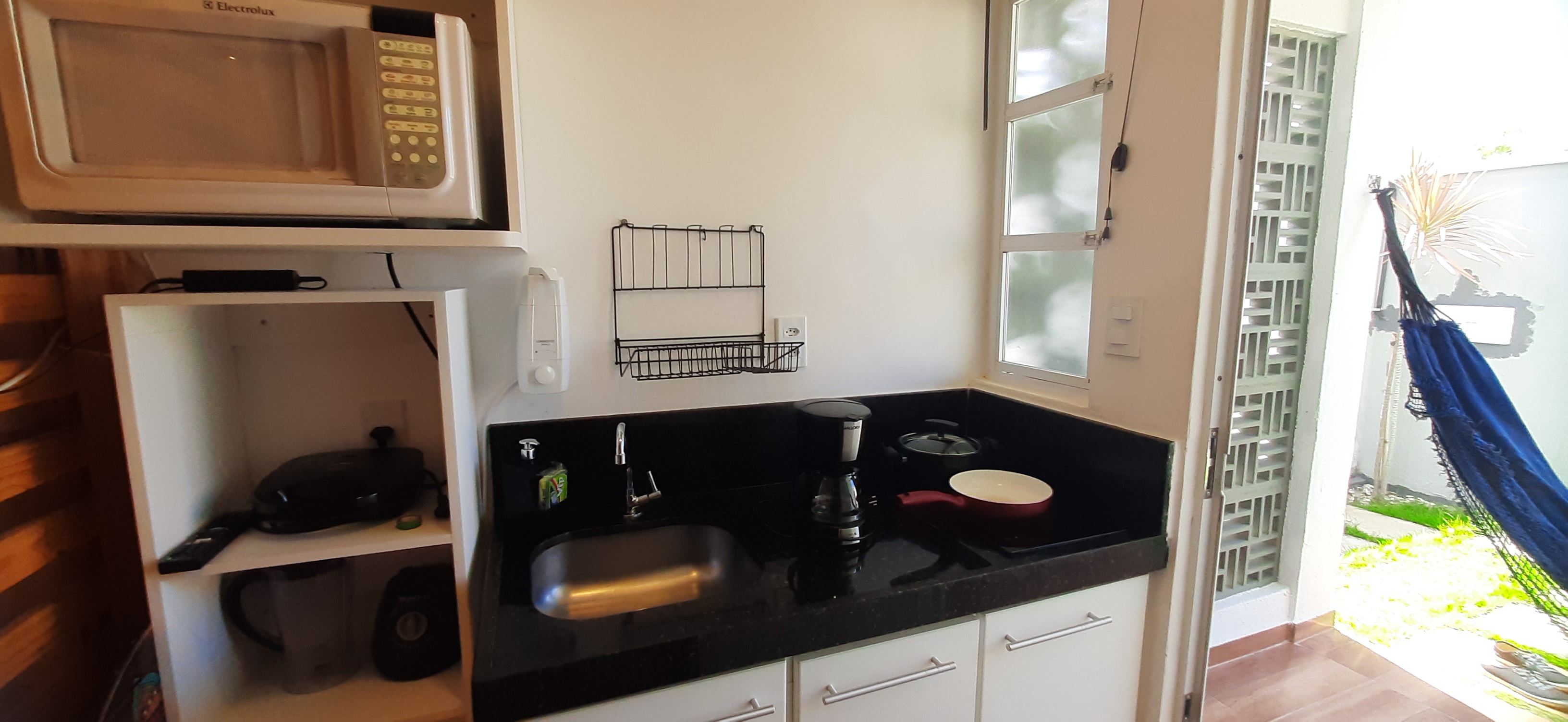 Composto por 1 cama de casal 1 cama de solteiro (com enxoval), wi-fi fibra ótica, Smart TV com Netflix, cozinha completa (pratos, talheres, copos, panelas, micro-ondas, cafeteira, liquidificador, fogão cooktop de indução, geladeira, filtro de água), varanda nascente com rede integrada ao jardim com chuveirão, área de lavanderia com varal.
